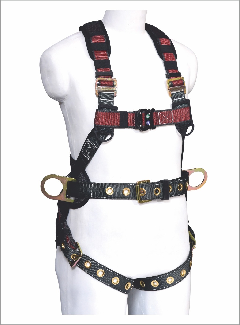 Made up of high tenacity polyester 1 Back D-ring for Fall Arrest, and 2 D-rings at waist level for Positioning 6 point adjustability